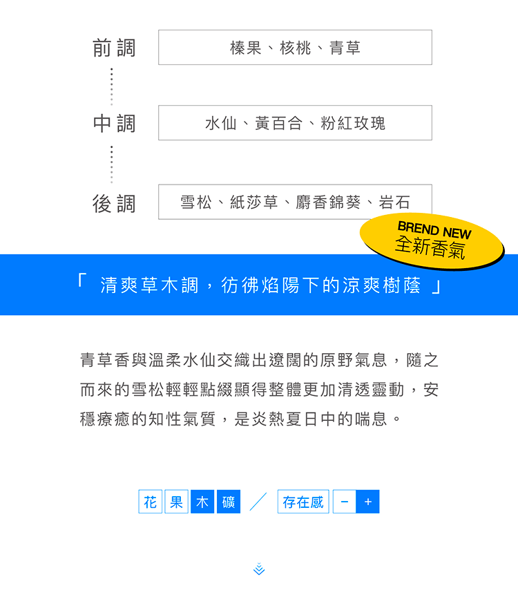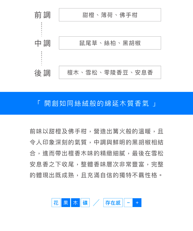 後調:檀香、琥珀、麝香、雪松、橡苔、綠茶